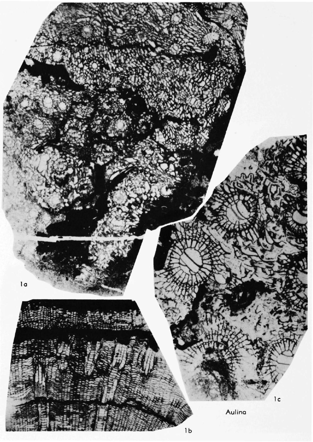 Fig. 252,1a,b. *A. rotiformis, Namur.,mathrm{E}_{2}, Linn Spout Ls., Scot., near Dalry, a, b, transv., long. secs., X3 (Hill, 1938-1941).-Fig. 252,1c. A. senex, holotype, Namur., Upper Ls. Ser., E2, superior beds, Scot., Glencart, near Dalry, transv. sec., X3 (Hill, 1938-1941).