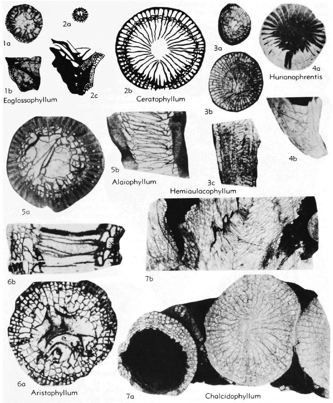 Fig. 170,2a-c. *C. typus, low. Givet., Pol., Skaly, a, transv. sec., early stage, b, transv. sec., late stage, c, long. sec., all X2 (Fedorowski, 1967a).