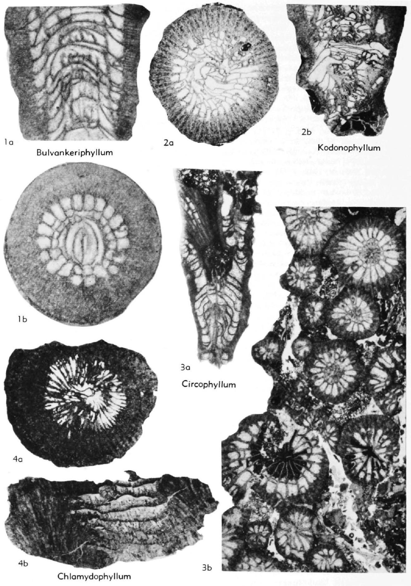 Fig. 99,4a,b. *C. obscurum, up. Koneprusy Ls., Czech., Zlatý Kůň near Končprusy; a, lectotype, transv. sec., X2; b, paralectotype, long. sec., X2 (Oliver & Galle, 1971b).
