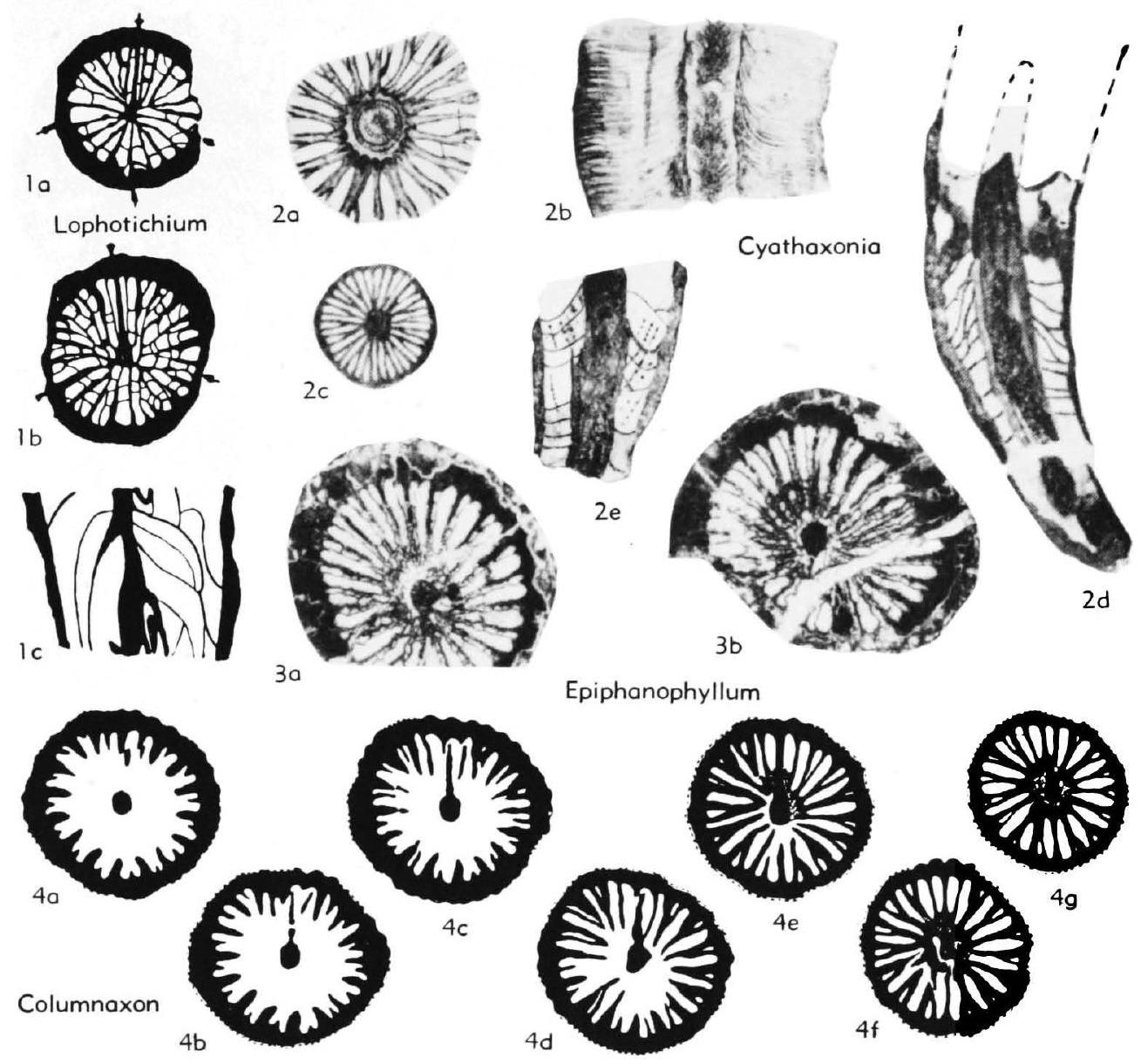 Fig. 111,2a-e. *C. cornu; a,b, L. Carb.(Visean), Scot., Southfold Quarry, Dunfermline, central part of transv. sec., long. sec. through septa and columella, X 8; c,d, L.Carb. (Tournais.), Belg., Cornet Quarry, Tournai, transv., long. secs., X4; e, L.Carb.(Visean), Eng., Stock, near Bracewell, long. sec. showing vepreculae on sides of septa, X5 (Carruthers, 1913).