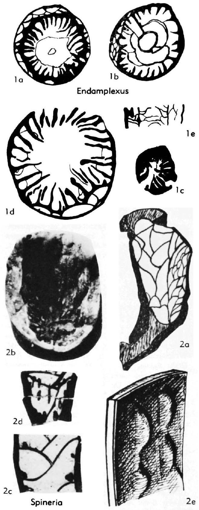 Fig. 231,1a,b. *E. dentatus, holotype, Basleo, a,b, thin secs., X2 (Koker, 1924). --Fig. 231, 1c-e. E. makros (Schouppé& Stacul), holotype, Basleo, c,d, transv., e, long. secs., X2 (Schouppé& Stacul, 1959).