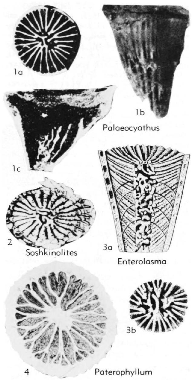 Fig. 94, 3a.b. *E. strictum (Hall), L.Dev.(Helderberg.), N.Y., Clarksville, a, natural long. sec., enl., b, axial ends of major septa in natural transv. sec., enl. (Simpson, 1900)