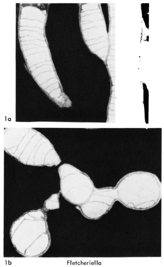Fig. 434,1a,b. *F. evenkiana, holotype, Dolbor., basin of R. Stony Tunguska, a, b, long., transv. secs., X2.3 (Sokolov, 1962c)