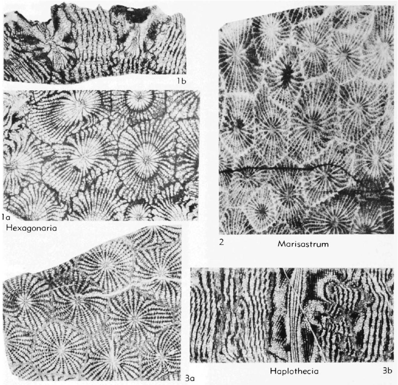 Fig. 176,1a,b. *H. hexagona (Goldfuss), neotype, probably up. Givet. or low. Frasn. Refrath beds, Ger., Bensberg, a, b, transv., long. secs., X1.7 (Hill& Jell, 1970b).