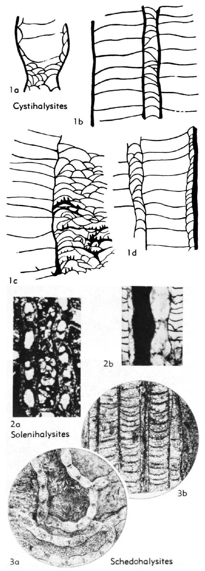 Like Halysites but with interstitial tubules absent in some parts of ranks and in some connections of ranks; septal spinules or ridges weakly developed to absent.