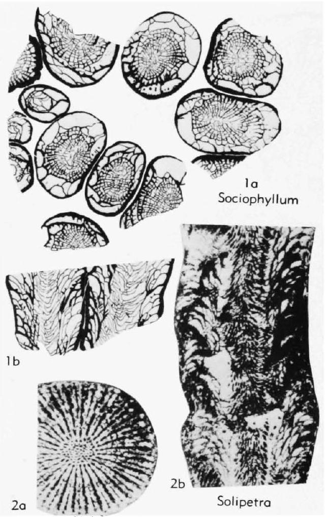 Fig. 158,1a,b. *S. elongatum (Schlüter), lectotype, "Berndorf," ?Givet., presumably within range Ahbach Beds to Cürten Beds, Ger., Eifel, a, b, transv., long. secs., X1.2 (Birenheide, 1962a).