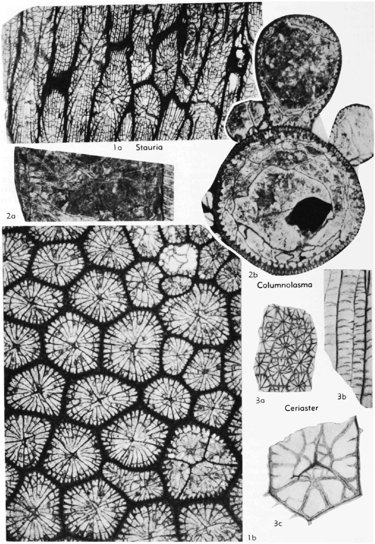 Fig. 68,la,b. *S. favosa (LINNE), M.Sil., Slite Gr., Gotl., Bogeklint; a,b, oblique, transv. secs., X2, X4 (Hill, n; UQF34301).