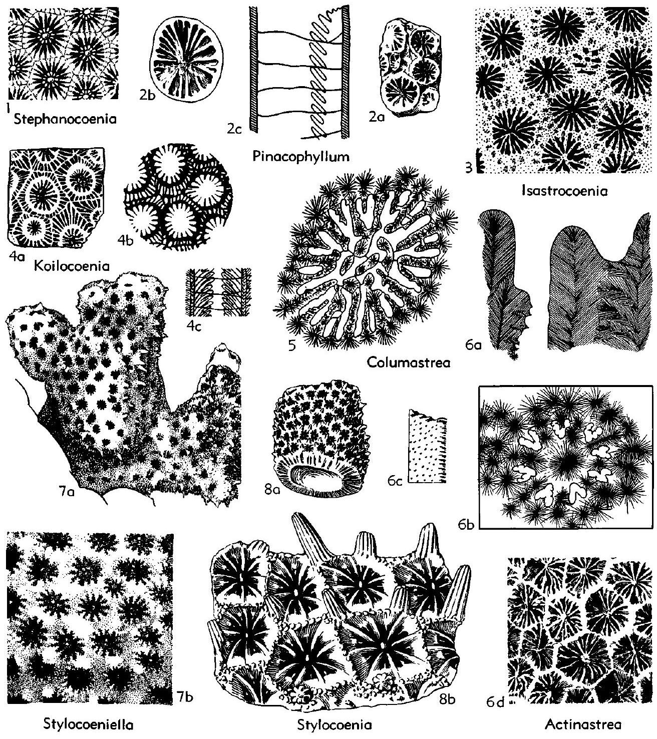 Plocoid to subcerioid, massive, Costae short, Septa with minutely dentate margins, one crown of 12 pali before first 2 septal cycles, Columella styliform